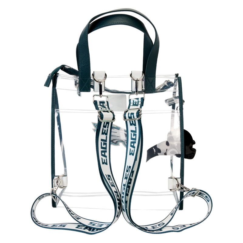 Feeling game-day ready? Cheer on your favorite football team with this convertible tote bag! The clear design makes it easy to bring your belongings into the stadium, and versatile shoulder straps help to keep your bag close as you wander the crowds. A chenille patch of the Eagles logo, a helmet-shaped bag charm, and coordinating team colors give this bag an elevated look. No need to sacrifice your style at the big game – this accessory is the perfect combination of fashion and function.